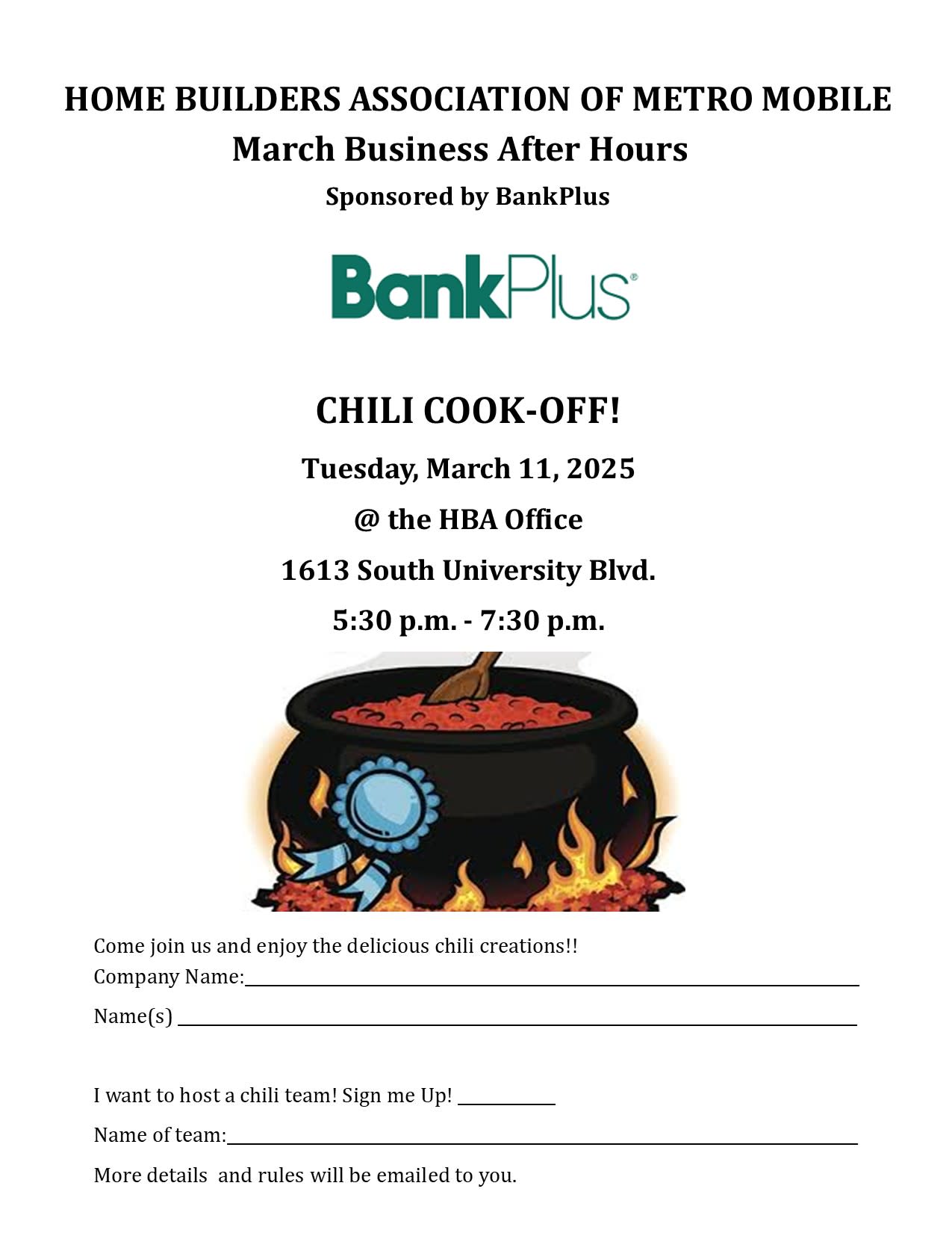 The teams that are providing Chili need to arrive to the HBA office before the event to set up and be ready to serve at 5:30.